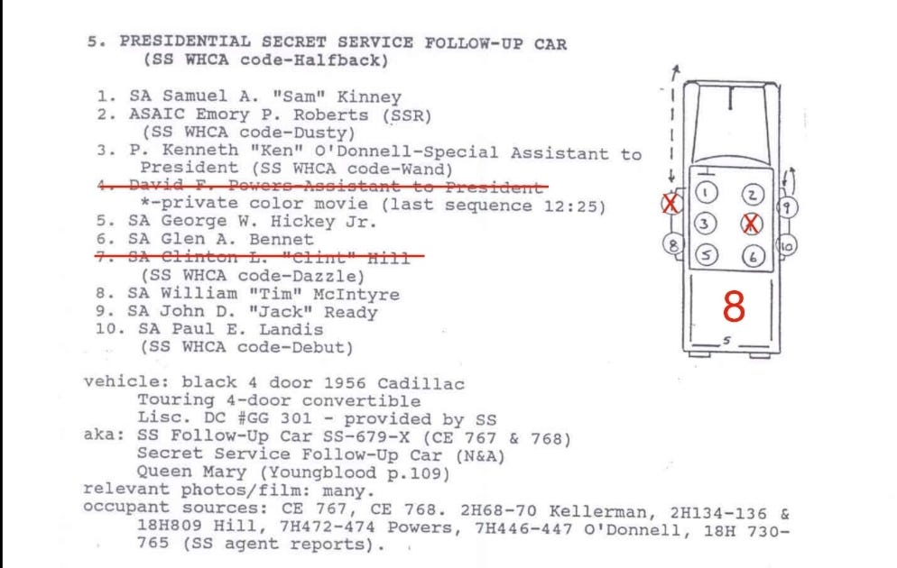 And why is there now 10 people on the car, instead of the 8 that are suppose to be there? David F. Powers, who is suppose to be in the secret service car, coincedentaly ran out of footage before the assassination. But no photos show him to be in the secret service car at the time of the shooting.