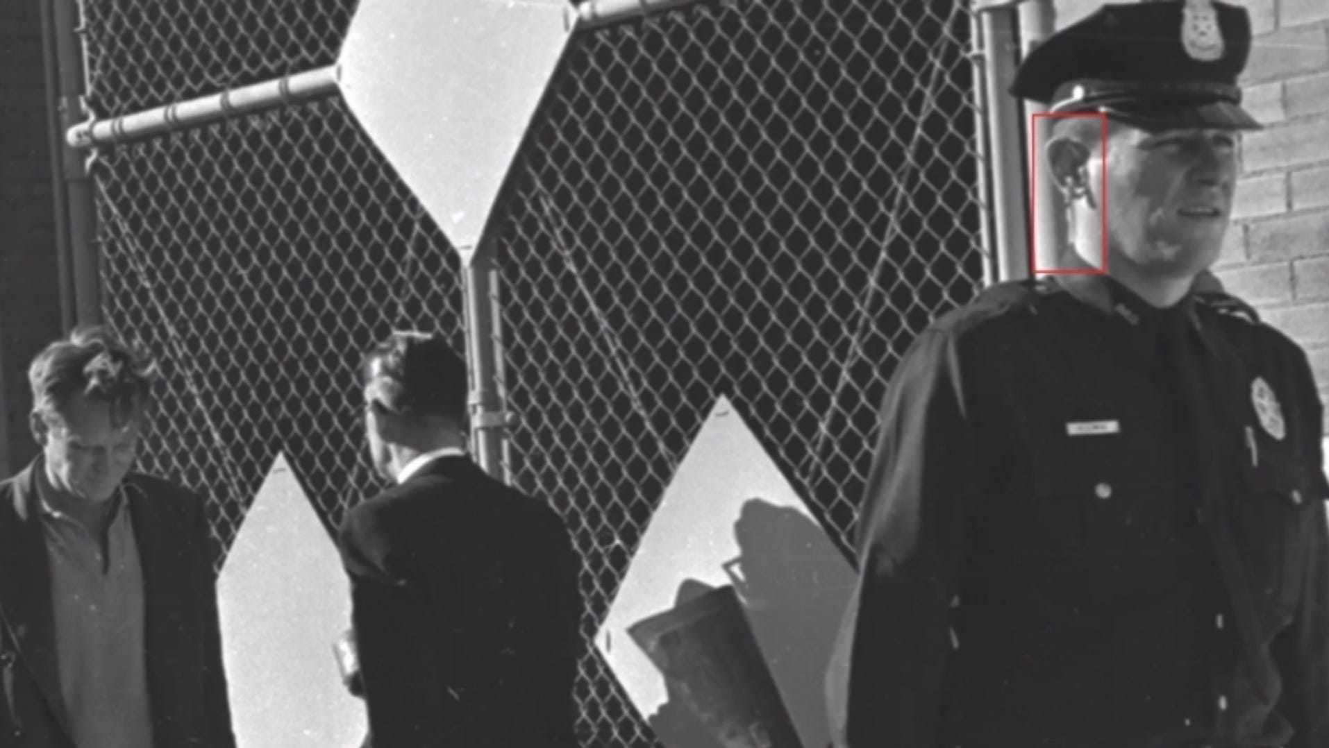 Marvin Weiss, the officer escorting the tramps clearly has a wire in his ear, although he claimed was a wad of cotton.